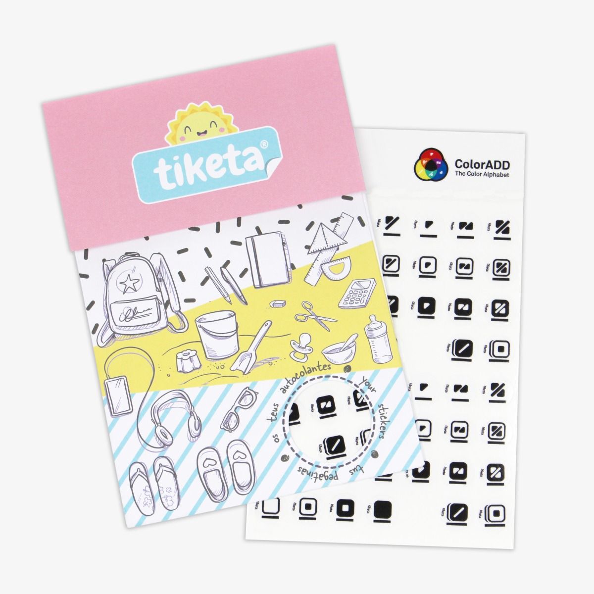 Etiquetas autocolantes para objetos com o alfabeto das cores ColorADD.Ideais para colocar em objetos onde é necessário a correta identificação das cores, como por exemplo, lápis de cor, marcadores, etc.5 cartelas com os simbolos ColorADD. Cada cartela contém 54 etiquetas (2 x 27 códigos de cores).