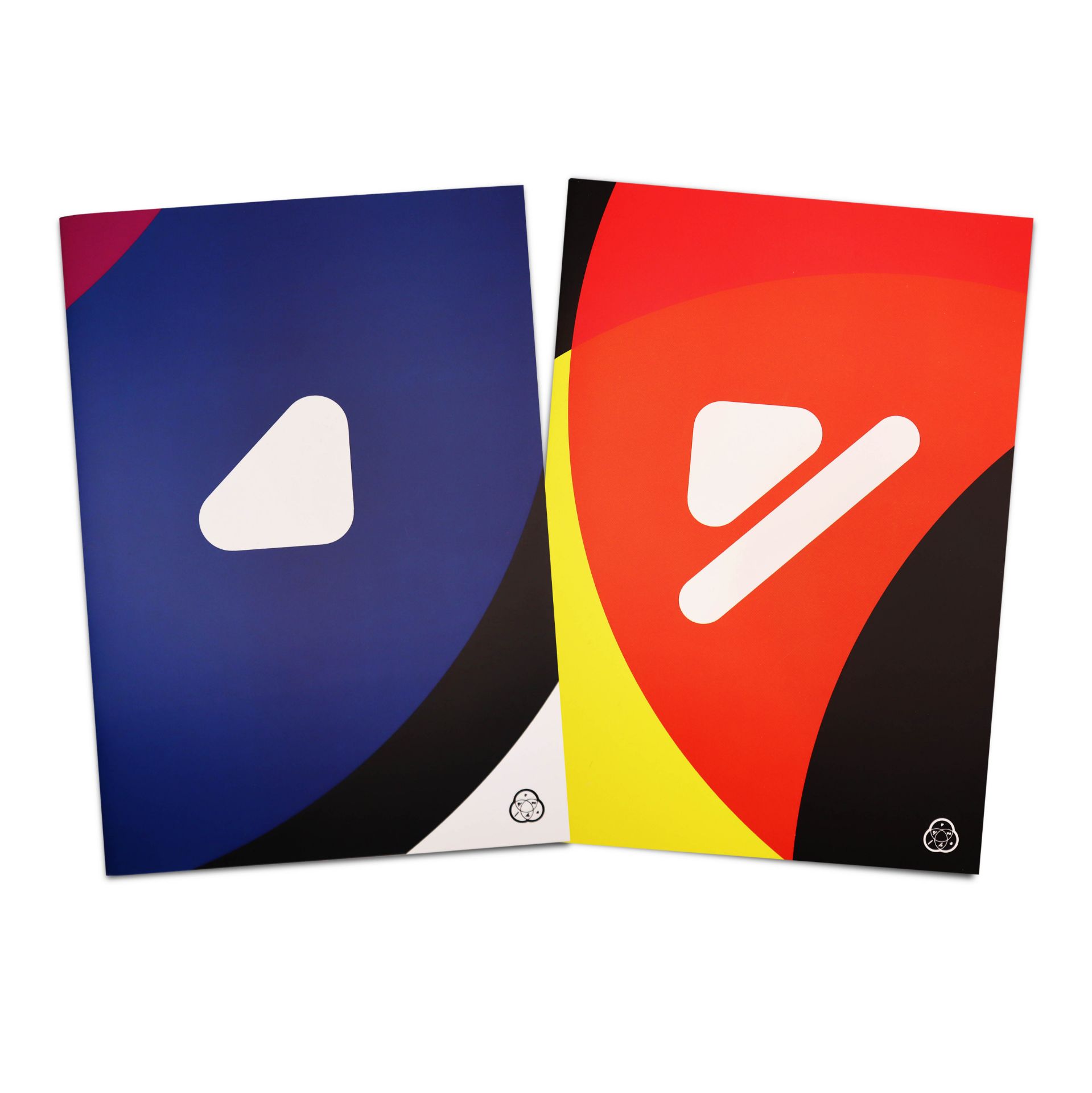 Sebenta A5, de folhas pautadas, com 2 opções de capa colorida (azul ou laranja) e símbolo ColorADD correspondente.